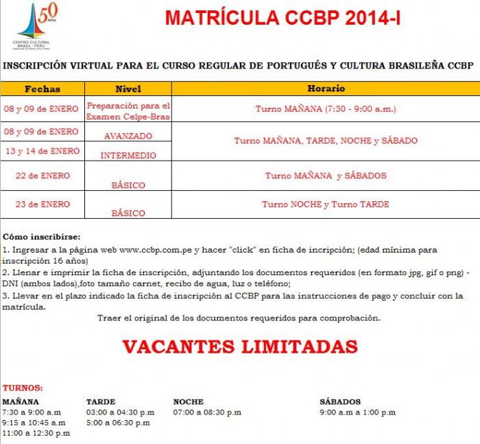 MATRÍCULA CCBP 2014-I INSCRIPCIÓN VIRTUAL PARA EL CURSO REGULAR DE PORTUGUÉS Y CULTURA BRASILEÑA CCBP
