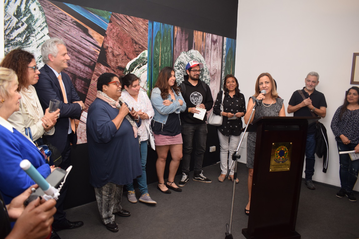 Artista y Profesora de arte Sra. Olga Flores (PUCP), Sra. Rozenilda Falcão - Directora del Centro Cultural Brasil-Perú (CCBP), Sra. Raquel Pires-Secretaria del Sector Cultural de la Embajada de Brasil en Lima y el Ministro Sr. Elio Cardoso.