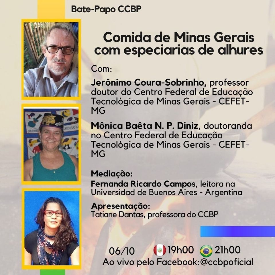 BATE-PAPO CCBP "Comida de Minas Gerais com especiarias de alhures", com Jerônimo Coura-Sobrinho - professor doutor do Centro Federal de Educação Tecnológica de Minas Gerais - CEFET-MG, e Mônica Baêta N. P. Diniz - doutoranda no Centro Federal de Educação Tecnológica de Minas Gerais - CEFET-MG.