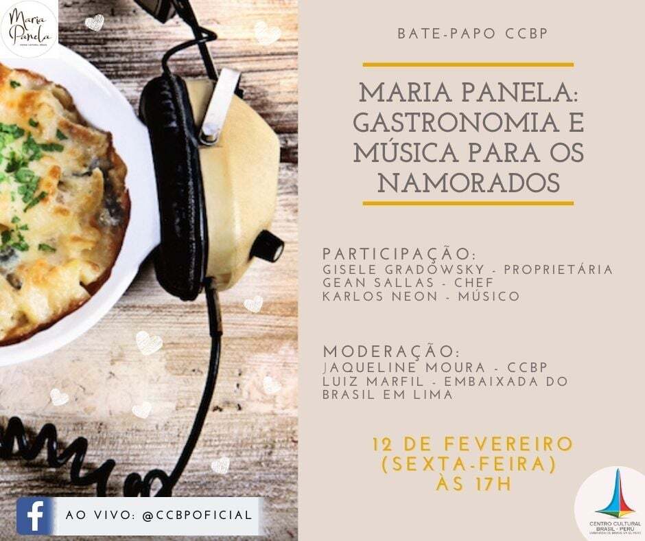 Bate-papo CCBP: “Maria Panela: gastronomia e música para os namorados” ♥ Dia 14 de fevereiro é celebrado o dia do amor e da amizade, e para comemorar, te convidamos pra aprender um prato típico brasileiro ao som de clássicos da MPB. Obs: O evento ocorrerá no contexto da abertura do ano acadêmico do CCBP, em 10/2. Data: Sexta-feira, 12 de fevereiro Hora: Às 17h00 🇵🇪 / 19h00 🇧🇷 Transmissão na nossa página! https://www.facebook.com/ccbpoficial Esperamos todos vocês!