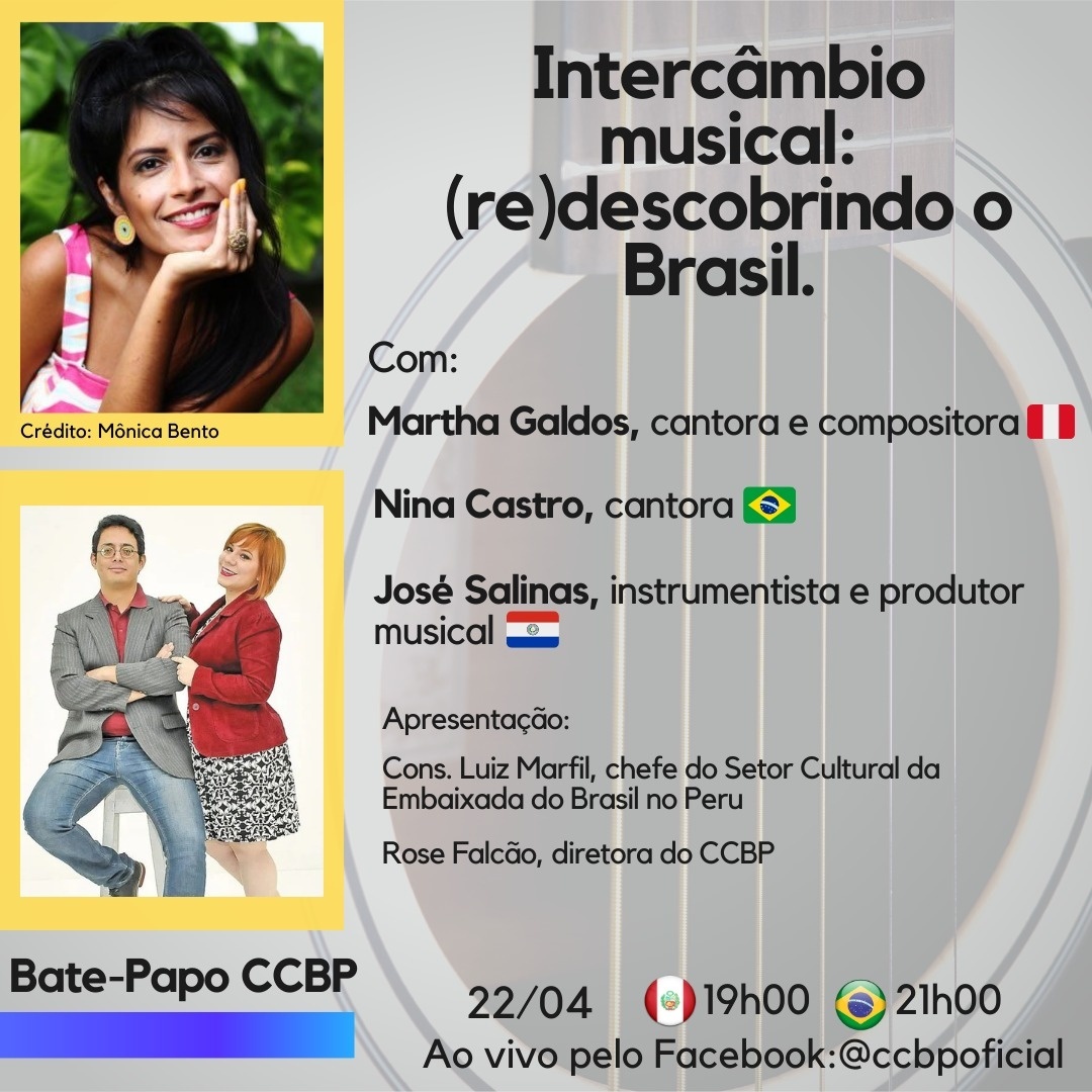 AMANHÃ, quinta-feira (22/04), o Bate-papo CCBP receberá Martha Galdos , Nina Castro e José Salinas para uma conversa descontraída sobre Intercâmbio Musical: (re)descobrindo o Brasil. Um olhar sobre a música brasileira, 521 anos depois da chegada dos portugueses.