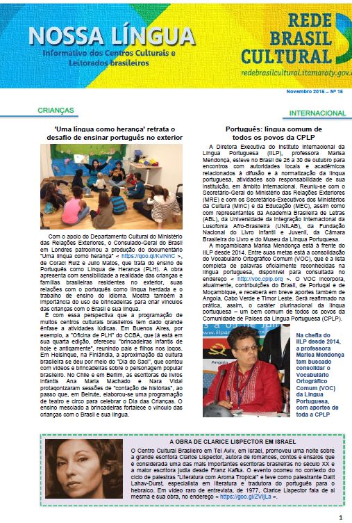 Documentário: 'Uma língua como herança' retrata o desafio de ensinar português no exterior Internacional: Português: língua comum de todos os povos da CPLP Israel: A obra de Clarice Lispector em Israel Literatura: Novos autores da literatura brasileira são temas de palestra em Buenos Aires. CCBs: Centros Culturais brasileiros: espaços de promoção também das culturas locais. Concurso: III Concurso de Redação teve ampla participação