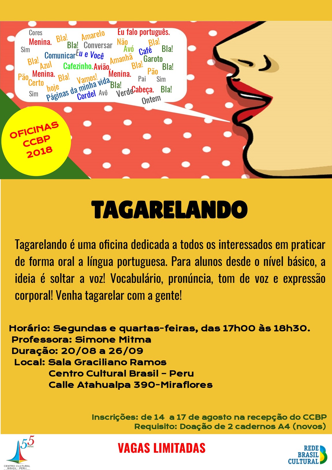El taller "Tagarelando" es dedicado a todos los interesados en practicar de forma oral la lengua portuguesa. Destinado a alumnos desde el nivel básico, la idea es soltar la voz, vocabulário, pronunciación, tono de voz y expresión corporal.
