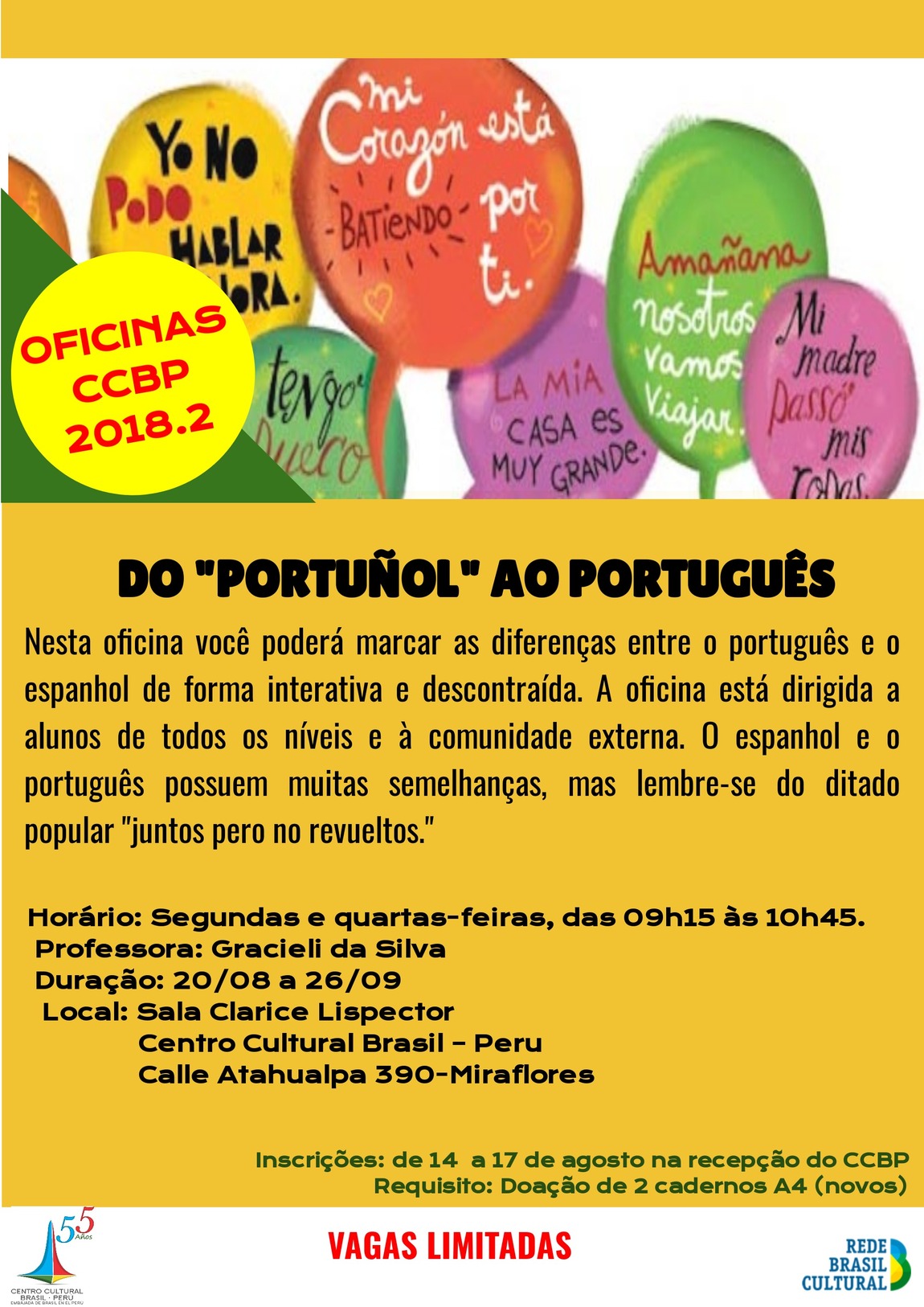 Este taller usted podrá marcar la diferencia entre el portugués y el español de forma interactiva y descontraida. La oficina está dirigida a alumnos de todos los niveles y comunidad externa.