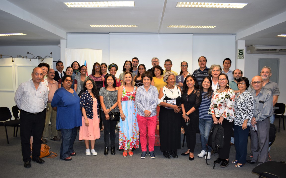 Violeta Barriento acompañada de las artistas que participaron de la ExpoMUJER CCBP 2019 con la Directora del CCBP Rozenilda Falcão.