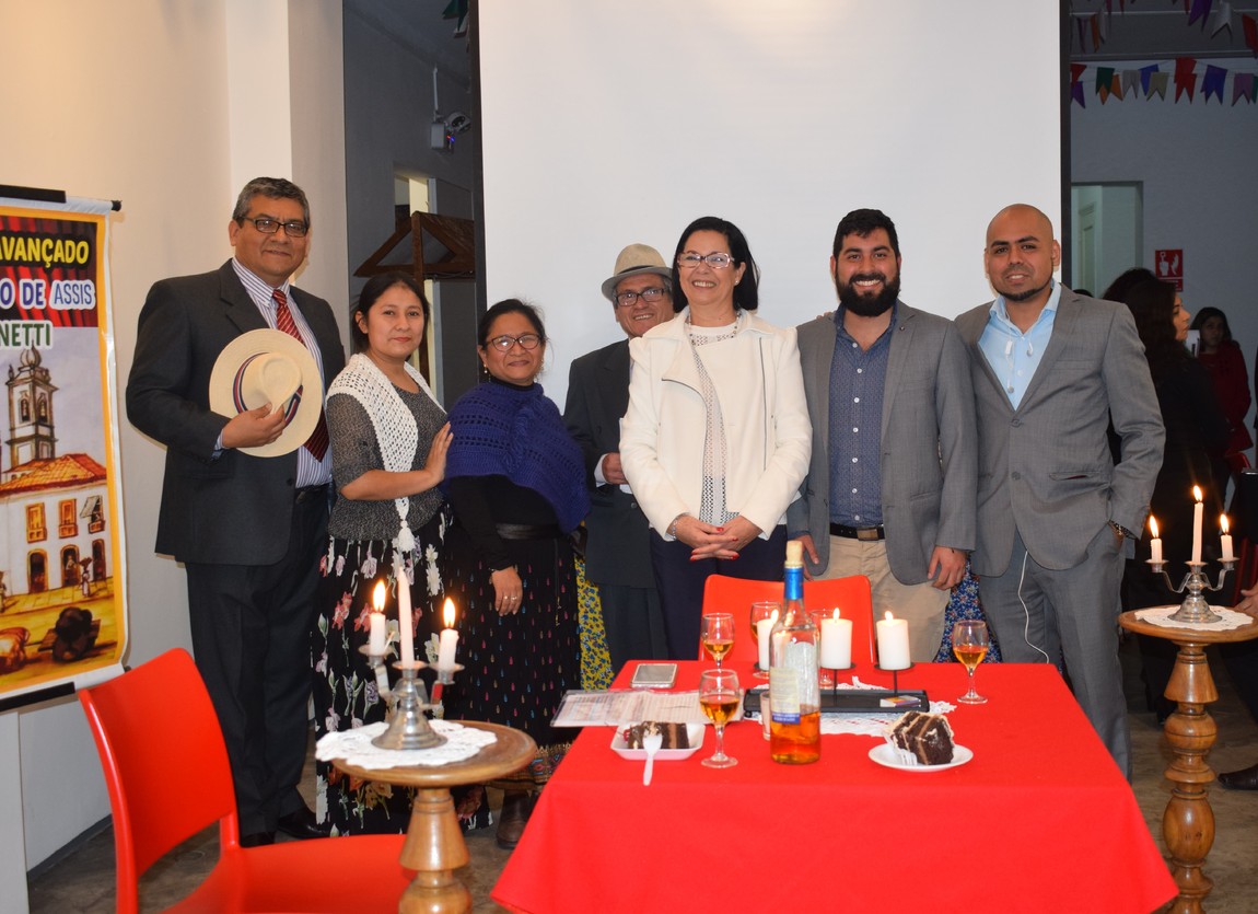 A professora Silvana Sanguinetti acompanhada de seus alunos do grupo avançado que apresentaram a encenação do conto "A missa do galo" do escritor Machado de Assis.