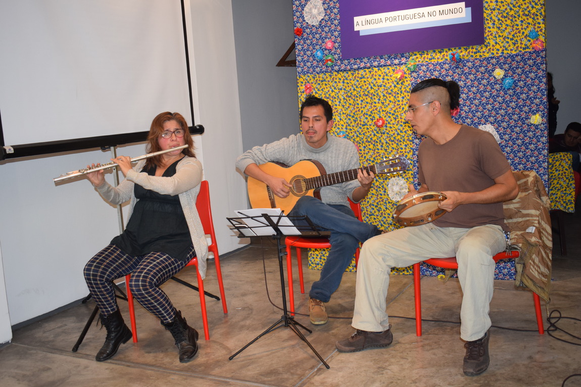 A coordenadora pedagógica Jaqueline Soares agradecendo aos professores do nível avançado, Lev Vidal e Silvana Sanguinetti.