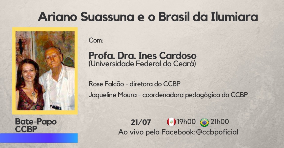#BATE-PAPO CCBP apresenta "Ariano Suassuana e o Brasil da Ilumiara" , com Profa. Dra. Ines Cardoso (Universidade Federal do Ceará), Rose Falcão - diretora do CCBP, e Jaqueline Soares - coordenadora pedagógica do CCBP.
