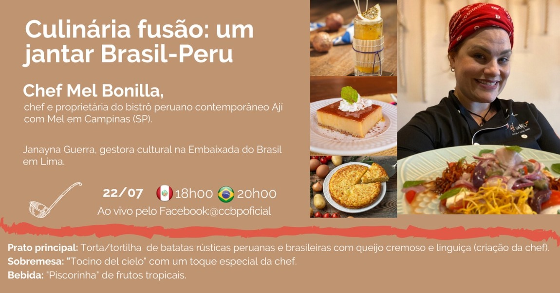 "Culinária fusão: um jantar Brasil-Peru", com a chef Mel Bonilla, chef e proprietária do bistrô "Ají com Mel" o restaurante nro 1, segundo o TripAdvisor, da cidade de Campinas (SP), e Janayna Guerra - gestora cultural na embaixada do Brasil em Lima.