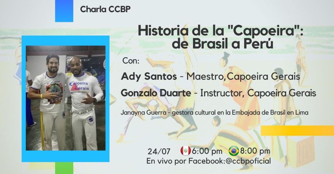 CHARLA CCBP presenta: "Historia de la Capoeira: de Brasil a Perú", con Ady Santos - maestro, Capoeira Gerais, Gonzalo Duarte - instructor, Capoeira Gerais y Janayna Guerra, gestora cultural en la Embajada de Brasil en Lima.