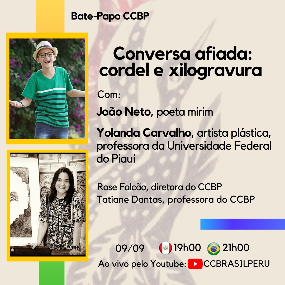 "Conversa afiada: cordel e xilogravura", com João Neto - poeta mirim, Yolanda Carvalho - artista plástica e professora da Universidade Federal do Piauí,