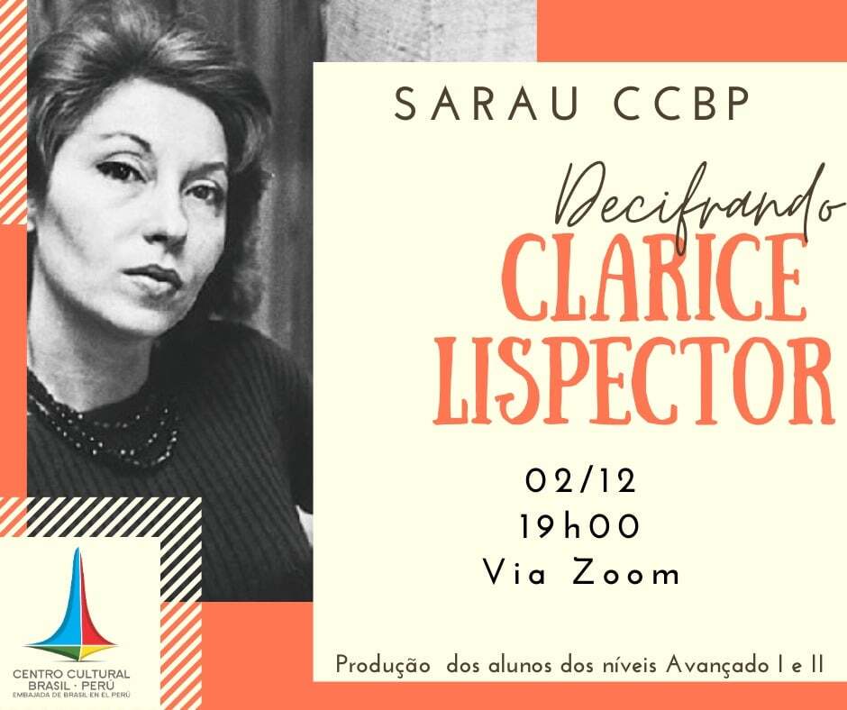 Quarta-feira tem SARAU VIRTUAL CCBP 2020.2: "Decifrando Clarice Lispector".O Sarau Virtual CCBP é um espaço destinado à apresentação dos projetos finais dos alunos dos níveis Avançado 1 e 2, desenvolvidos durante o semestre letivo.Data: quarta-feira, 02 de dezembro Hora: 19h00 – Via Zoom.