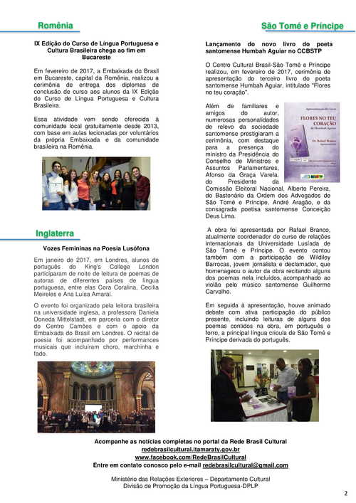 Centro Cultural Brasil-Perú Embajada de Brasil en el Perú Calle General Borgoño, 1156 - Miraflores • Lima • 2410654 Lunes a Jueves: 7.30 a.m. a 8:30 p.m.