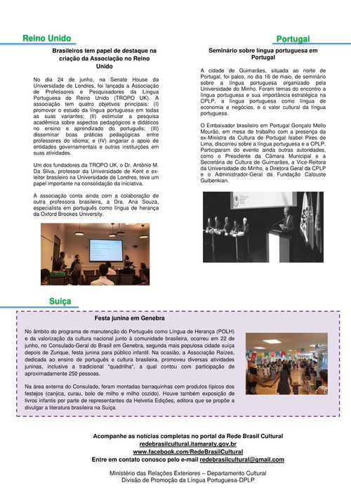 Centro Cultural Brasil-Perú Embajada de Brasil en el Perú Calle General Borgoño, 1156 - Miraflores • Lima • 2410654 Lunes a Jueves: 7.30 a.m. a 8:30 p.m.
